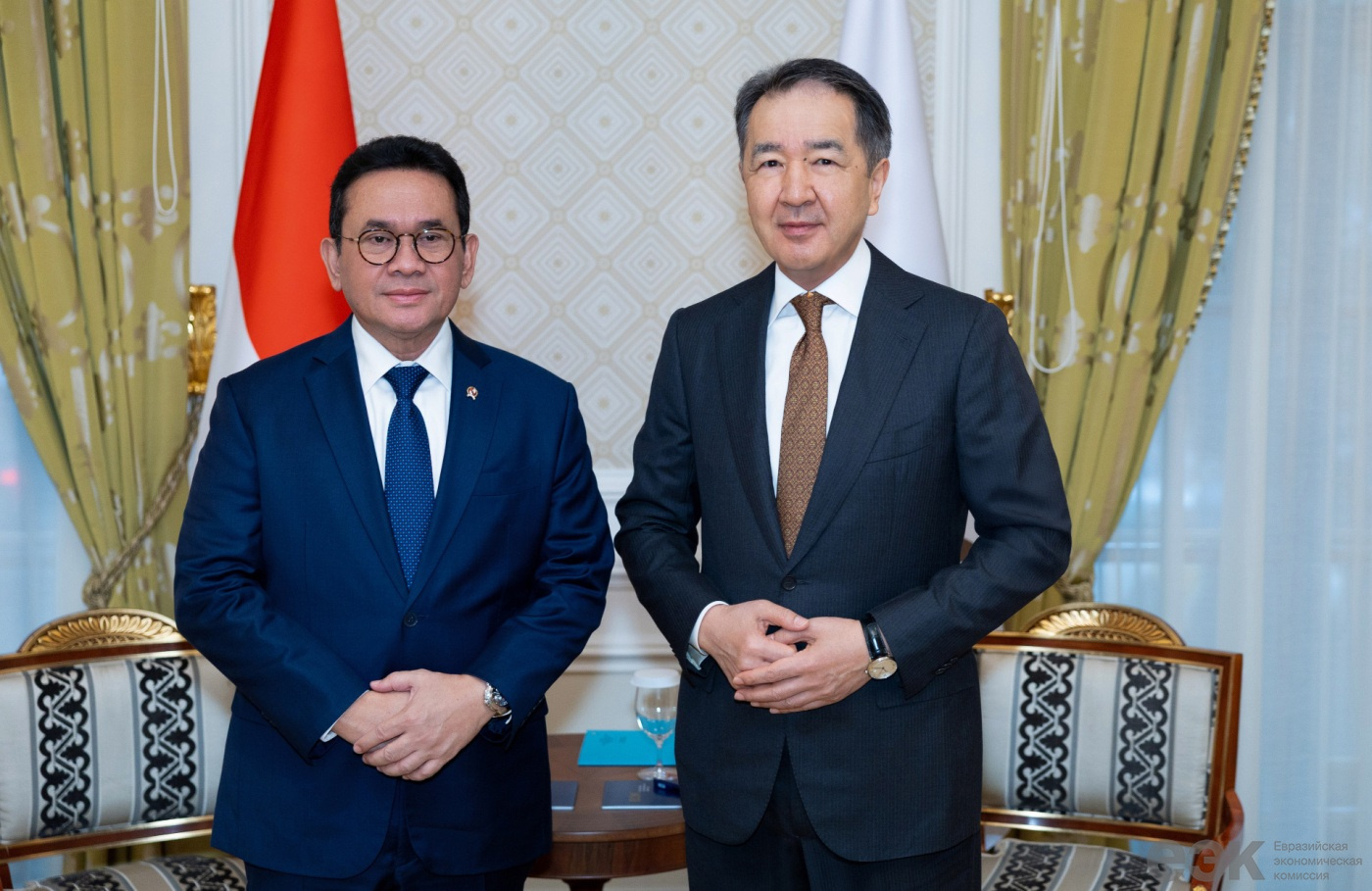 Старшыня Калегіі Еўразійскай эканамічнай камісіі Бакытжан Сагінтаеў 21 снежня ў Санкт-Пецярбургу правёў рабочую сустрэчу з міністрам гандлю Рэспублікі Інданезіі Будзі Сантаса.Бакі абмяняліся меркаваннямі па актуальных пытаннях сусветнага эканамічнага парадка дня, а таксама абмеркавалі перспектыўныя напрамкі супрацоўніцтва.