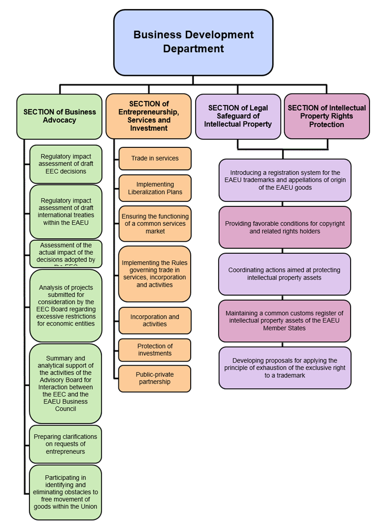 The Business Development Department of the Eurasian Economic Commission operates in the following areas: