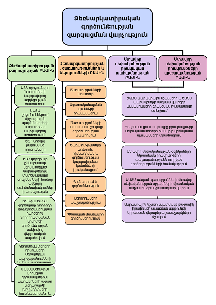 Եվրասիական տնտեսական հանձնաժողովի Ձեռնարկատիրական գործունեության զարգացման վարչությունն իր գործունեությունն իրականացնում է հետևյալ ոլորտներում.