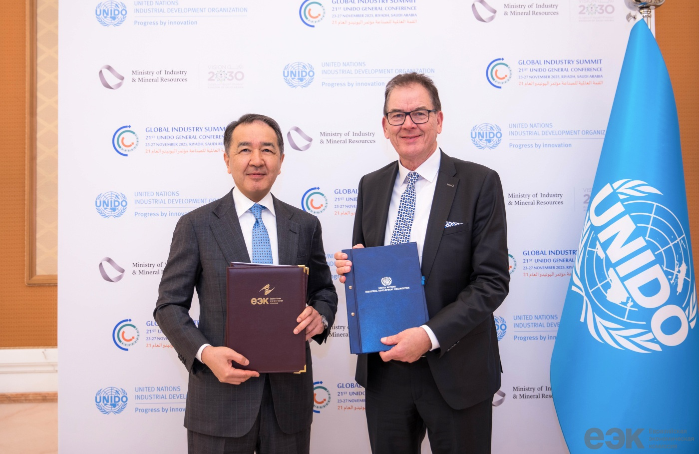 Նոյեմբերի 23-ին Էր-Ռիյադում՝ Միավորված Ազգերի Արդյունաբերական զարգացման կազմակերպության (ՅՈՒՆԻԴՕ) գլխավոր խորհրդաժողովի 21-րդ նստաշրջանի շրջանակներում Եվրասիական տնտեսական հանձնաժողովի կոլեգիայի նախարար Բակիտժան Սագինտաևը և ՅՈՒՆԻԴՕ գլխավոր տնօրեն Գերդ Մյուլերը ստորագրել են Համագործակցության հռչակագիր: