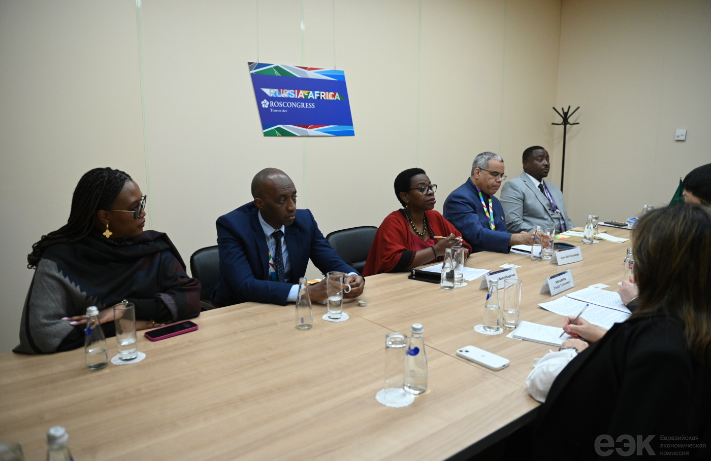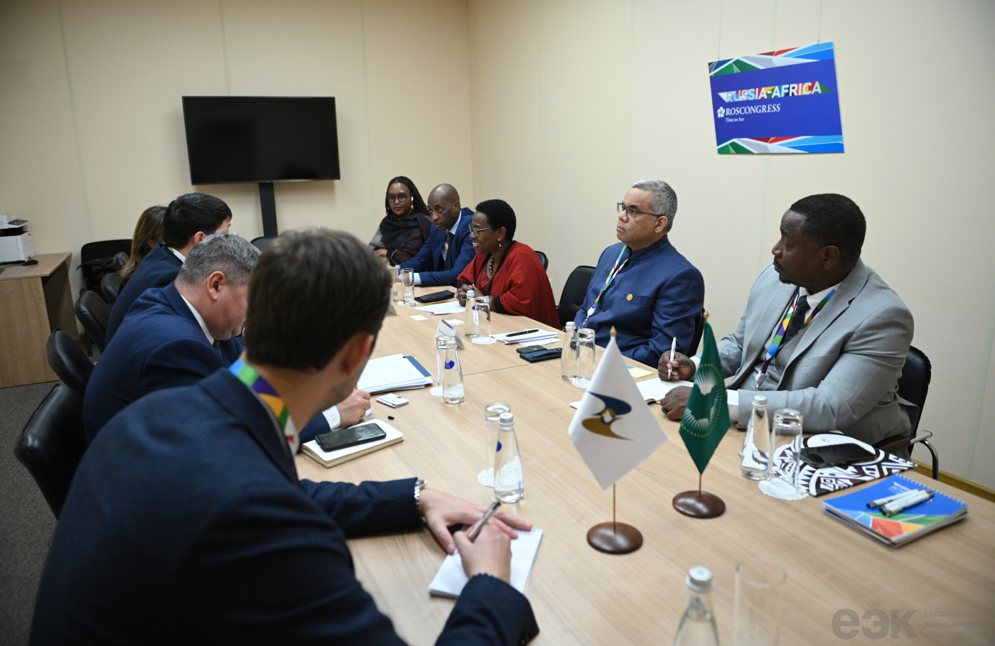 В ходе переговоров Эльдара Алишерова с заместителем Председателя Комиссии Африканского союза (КАС) Моник Нсанзабаганвой на полях Первой министерской конференции Форума партнерства «Россия – Африка» отмечено, что торгово-экономическое сотрудничество ЕАЭС и Афросоюза представляет для сторон взаимный стратегический интерес, основанный на схожести многих компетенций и направлений интеграционного строительства.Обсуждены практические аспекты подготовки нового меморандума о взаимодействии между ЕЭК и КАС, который будет содействовать реализации торгово-экономического потенциала стран ЕАЭС и Африки.